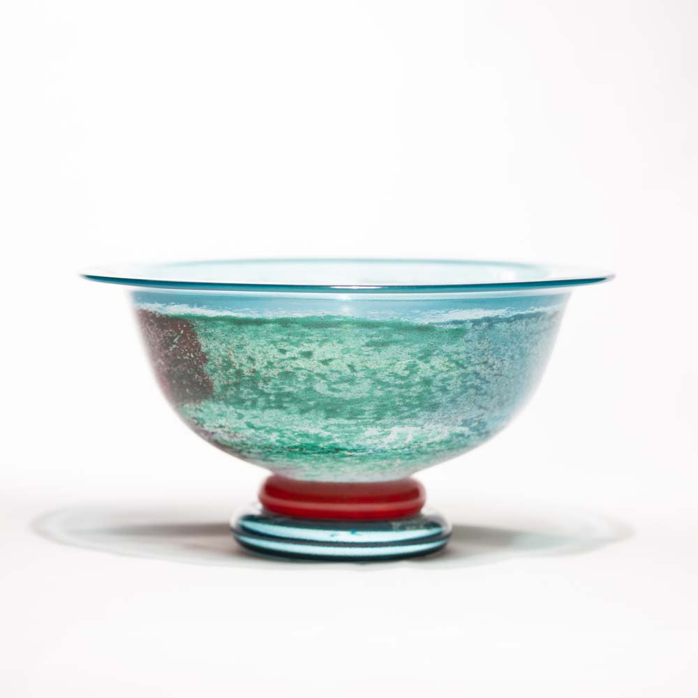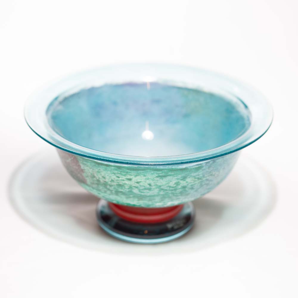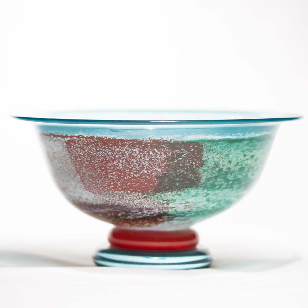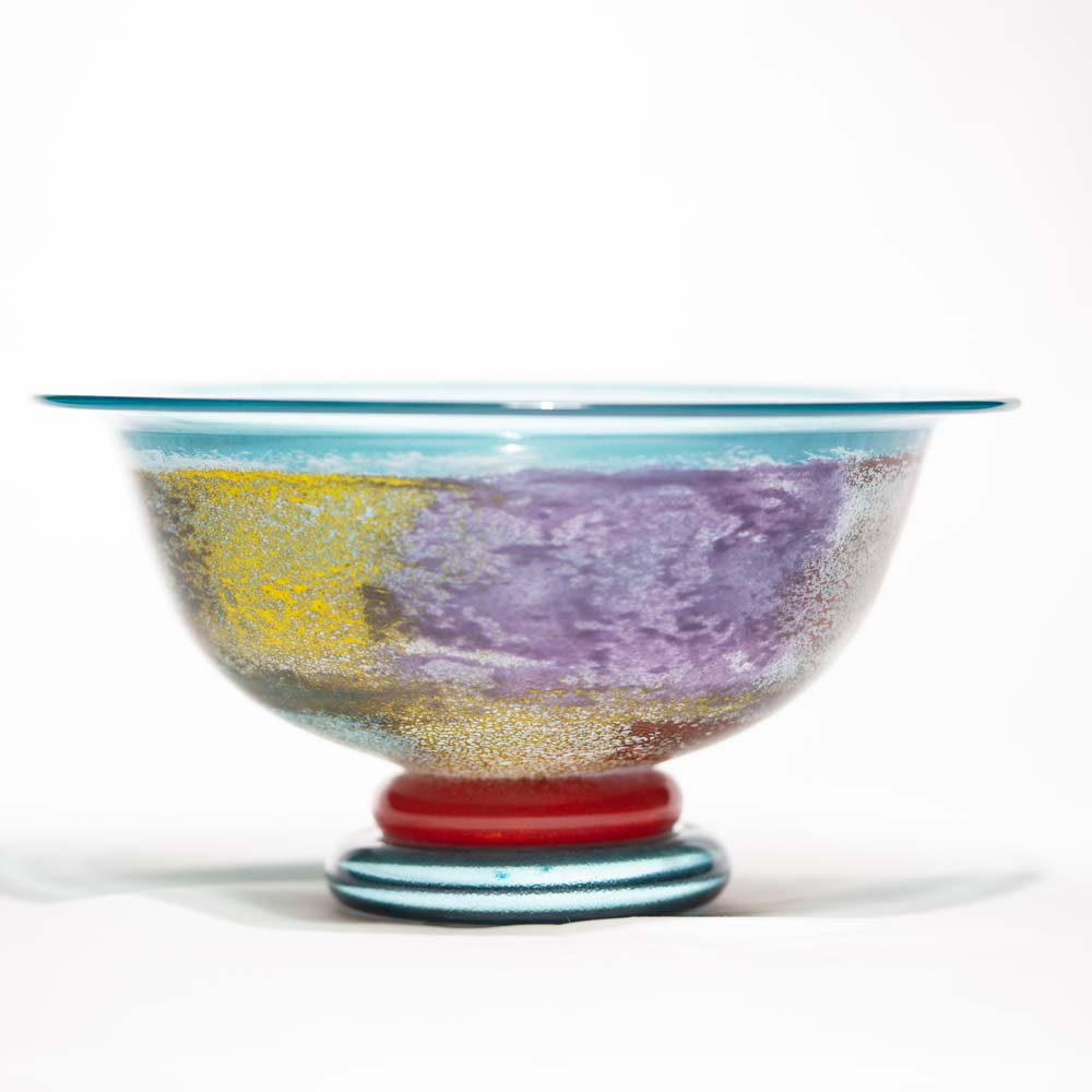 A pedestal blown glass bowl by Kjell Engman for Kosta Boda, featuring fluid color transitions from turquoise blue to vibrant red.